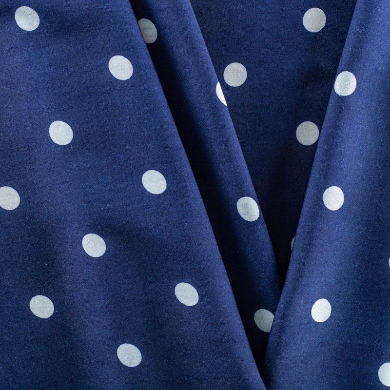 Плательно-блузочный штапель в белый горох на темно-синем фоне. Мягкий, тонкий, нежный, пластичный, приятный на ощупь, хорошо драпируется, практичный. Подойдет для пошива платья, топа, блузки, рубашки, юбки, летних брюк.