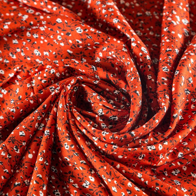Плательно-блузочный штапель с мелким растительным принтом на темном апельсиновом фоне. Мягкий, тонкий, нежный, пластичный, приятный на ощупь, хорошо драпируется, практичный. Подойдет для пошива платья, топа, блузки, рубашки, юбки, летних брюк, комбинезона.