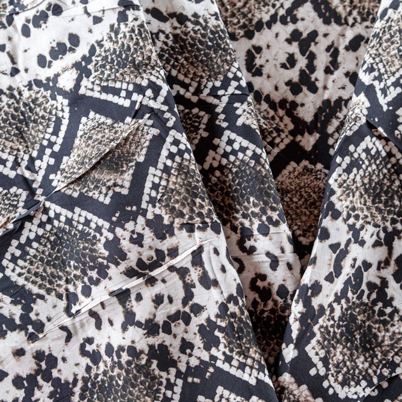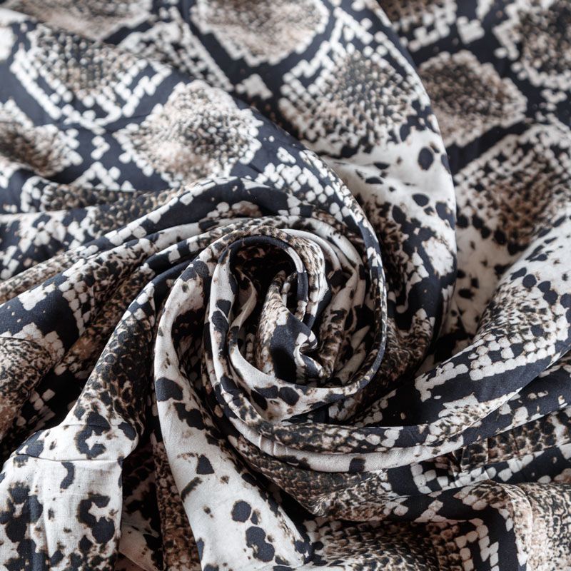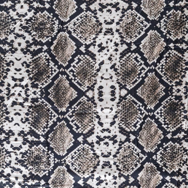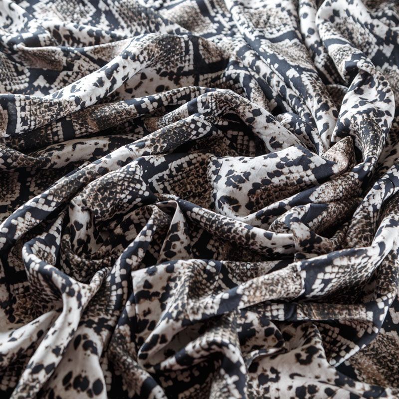 Итальянский плательно-блузочный штапель с анималистическим принтом в монохромной гамме. Ткань мягкая, тонкая, нежная и пластичная, приятная на ощупь, хорошо драпируется, практичная. Подойдет для пошива платья, топа, блузки, рубашки, юбки, летних брюк.