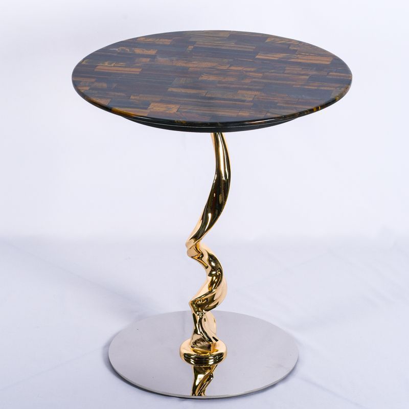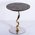 Столик кофейный/журнальный. Высота 50 см, диаметр столешницы 45 см. Подстолье выполнено из металла - золото хром, столешница - камень в коричневых оттенках.