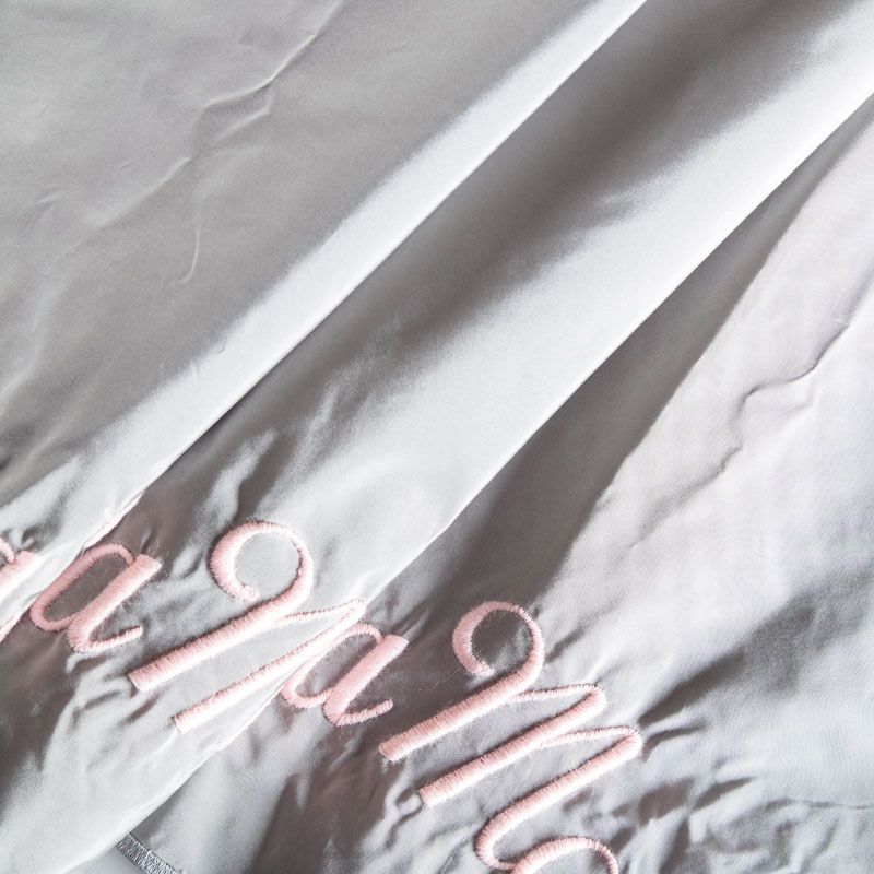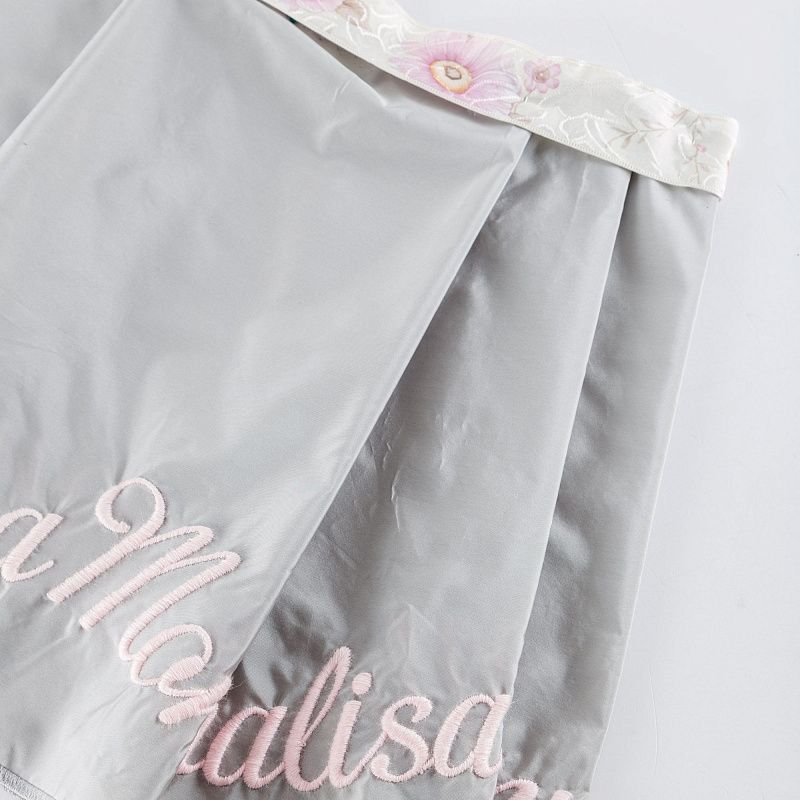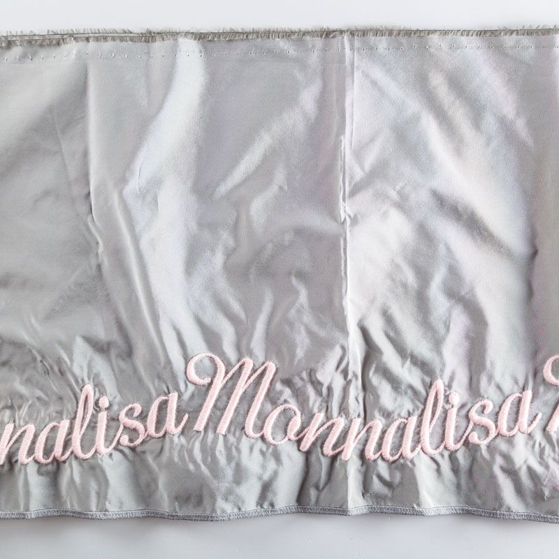 Вышивка на тафте Monnalisa высочайшего качества. Тафта жемчужно-серого оттенка тонкая, но плотная, отлично держит форму, драпируется красивыми жесткими складками и загибами. Фактура гладкая, с матовым блеском. Богатая объемная вышивка логотипа бренда выполнена шерстяной белой нитью идеально. Подойдет как для самостоятельного изделия: юбка, ярусное платье, плащ, парка, так и для декорирования любых изделий: вставка в рукав, оборка, кокетка и т.д.