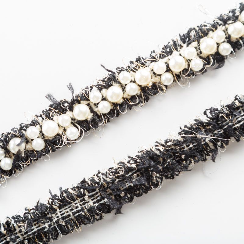 Тесьма декоративная выполнена из бархатистых нитей, прошита люрексом и украшена жемчужными бусинами. Бусины надежно закреплены на тесьме. Подойдет для отделки одежды из твида, букле в стиле Шанель.