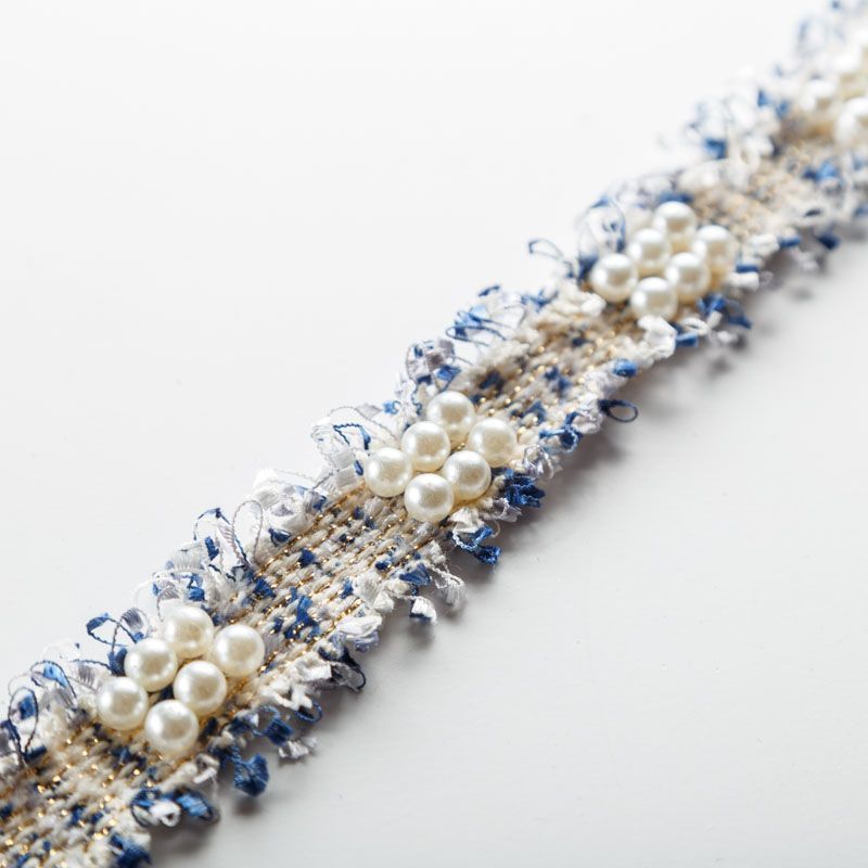 Тесьма декоративная 32 мм с жемчугом 586800 бежевый/синий/золотой