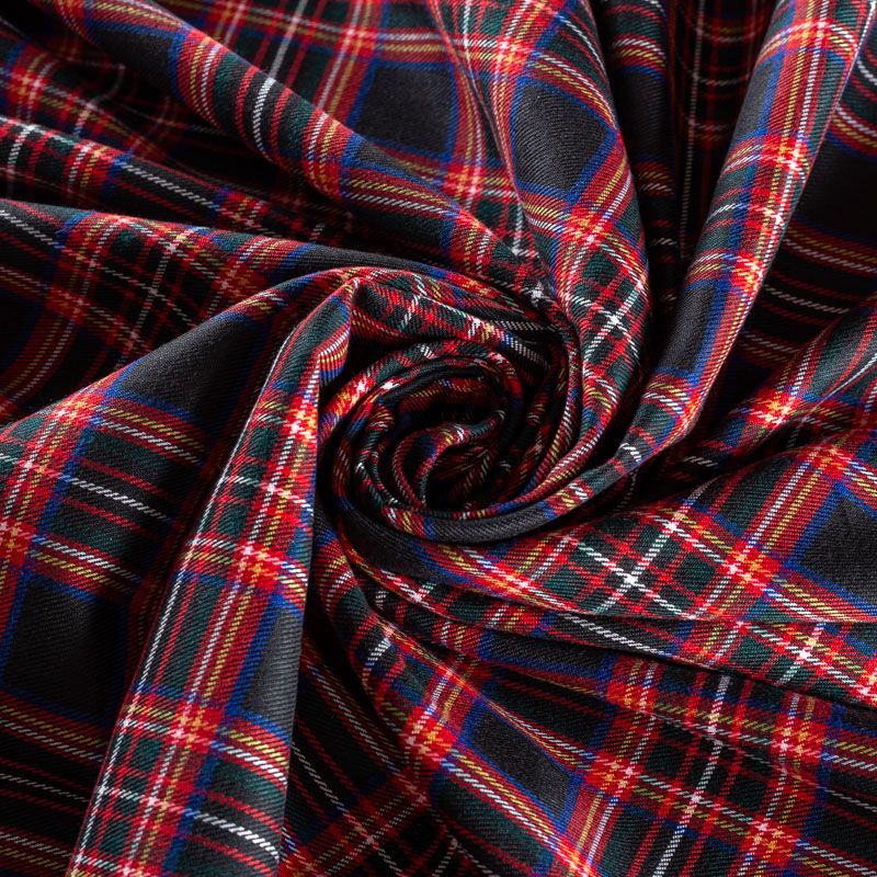 Ткань костюмно-плательной плотности, мягкая и приятная на ощупь, немного тянется за счет эластана в составе, держит форму, хорошо драпируется и образует мягкие складки. Сочетание тонких линий белого, красного, желтого и синего цветов на черном фоне образует сложную красивую клетку. Ткань отлично подойдет на костюмы, юбки, брюки, шорты, платья, жакеты.