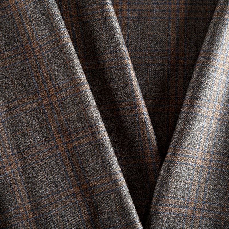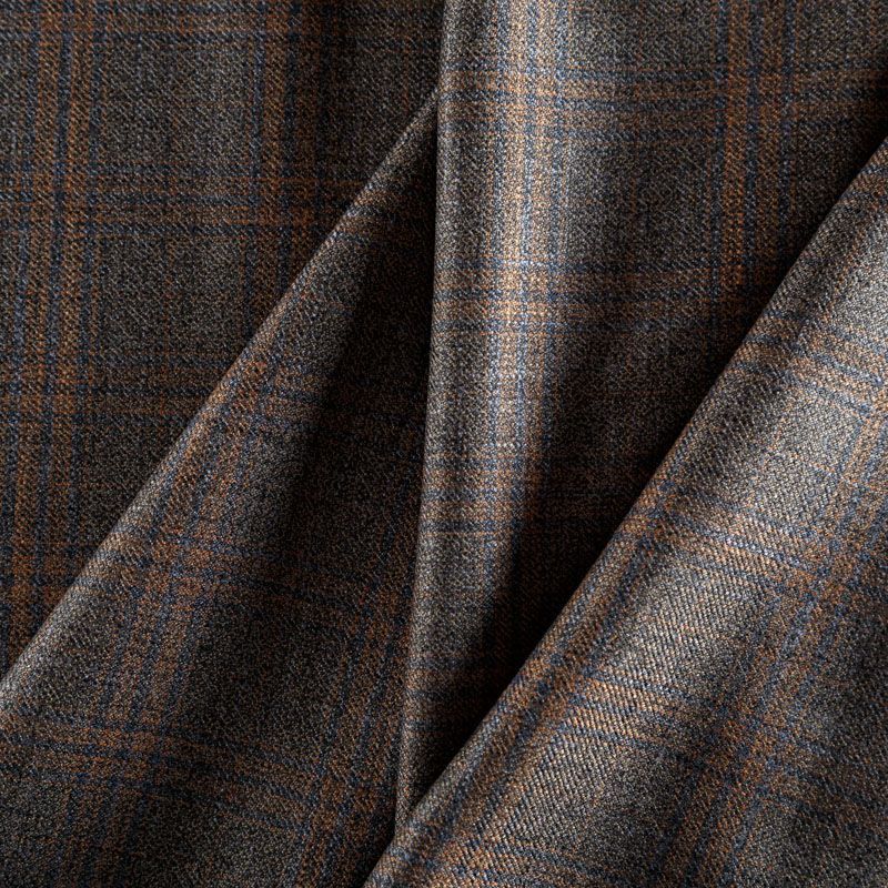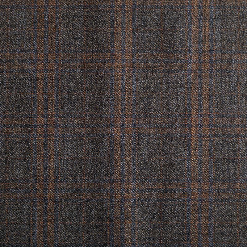 Итальянская костюмная шерсть с кашемиром серо-коричневого оттенка с сочетанием линий синего и приглушенно-оранжевого цвета, которые образуют крисивую и стильную клетку. Ткань очень приятная и мягкая на ощупь, не колется, пластичная, хорошо драпируется, ниспадает. Идеально подойдет для пошива брюк, юбки, платья или сарафана, костюма, жакета, палантина.