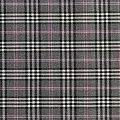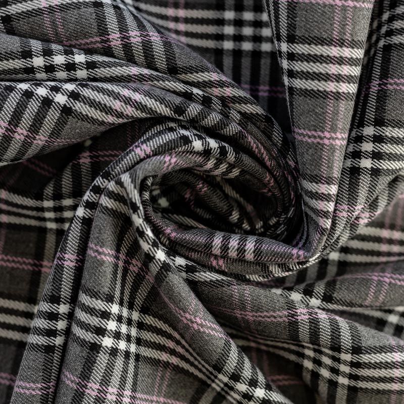Ткань средней плотности, мягкая и приятная на ощупь, немного тянется, формоустойчива, хорошо драпируется и образует мягкие складки. Сочетание линий черного, белого и розового цветов на спокойном сером фоне образует сложную красивую клетку тартан. Ткань отлично подойдет на костюмы, юбки, брюки, платья, жакеты.