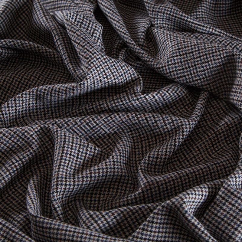 Итальянская костюмно-плательная шерсть средней плотности в песочном оттенке в мелкую куриную лапку. Ткань не сухая, пластичная, приятная на ощупь, почти не мнется, хорошо драпируется. Ткань отлично подойдет на костюм, жилет, жакет, легкое пальто, юбку, брюки, платье, сарафан, шорты.