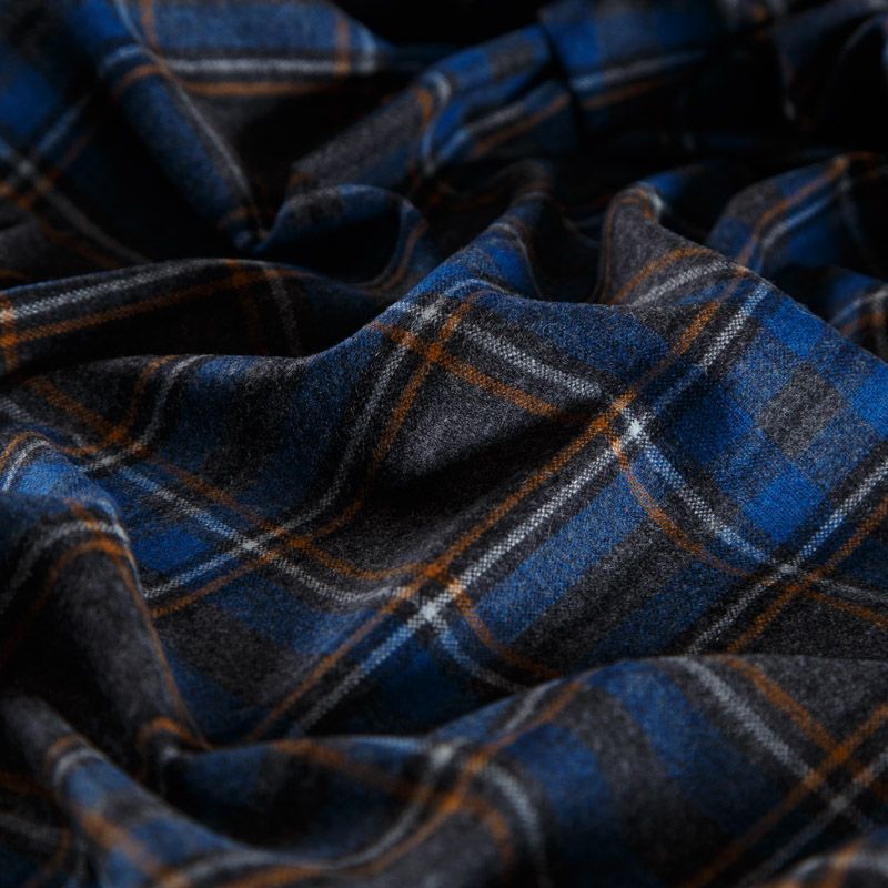 Итальянская костюмно-плательная шерсть средней плотности в графитовом оттенке, сочетание линий синего, белого, оранжевого и серого цветов образуют красивую клетку. Ткань не сухая, пластичная, приятная на ощупь, почти не мнется, хорошо драпируется. Отлично подойдет на костюм, жилет, жакет, юбку, брюки, платье, сарафан, шорты.