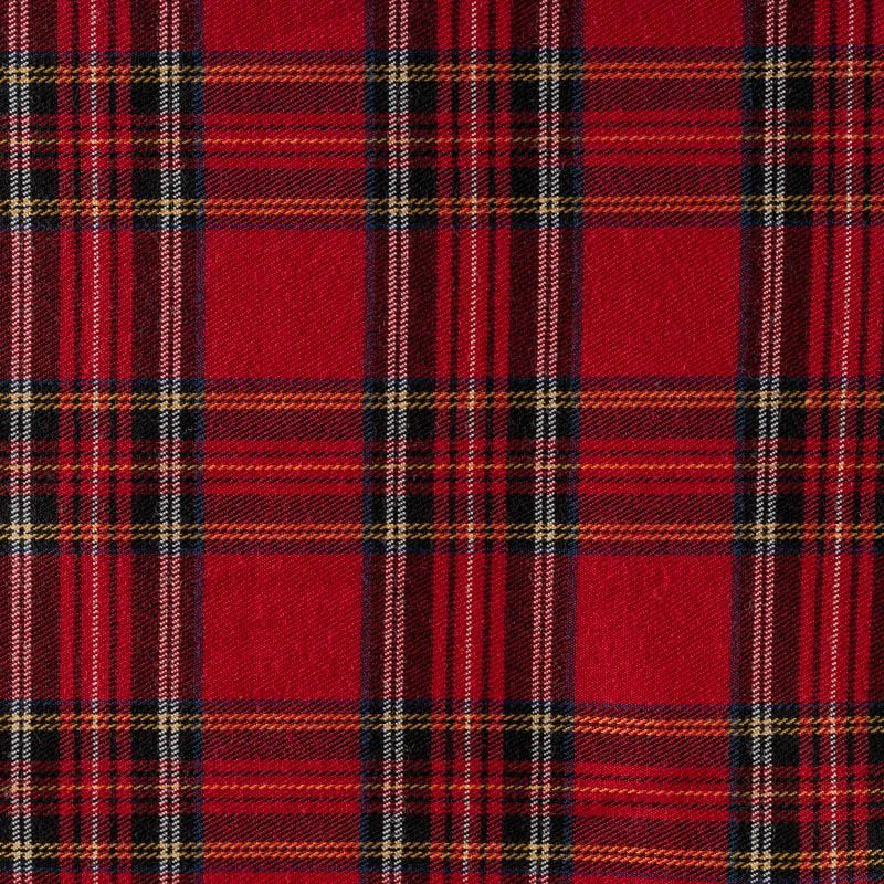 Ткань средней плотности, мягкая и приятная на ощупь, немного тянется, формоустойчива, хорошо драпируется и образует мягкие складки. Сочетание линий желтого, черного, синего и белого цветов на ярком красном фоне образует сложную красивую клетку тартан. Ткань отлично подойдет на костюмы, юбки, брюки, платья, жакеты.