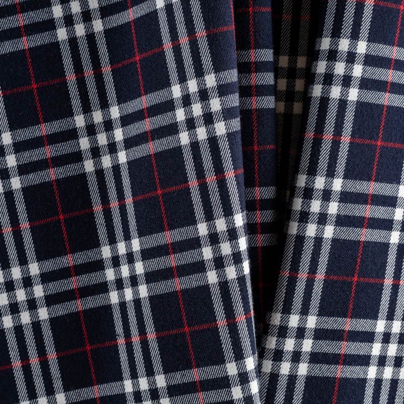 Ткань средней плотности, мягкая и приятная на ощупь, немного тянется, формоустойчива, хорошо драпируется и образует мягкие складки. Сочетание линий белого и красного цветов на темно-синем фоне образует сложную красивую клетку. Ткань отлично подойдет на костюмы, юбки, брюки, платья, жакеты, для школьной формы.