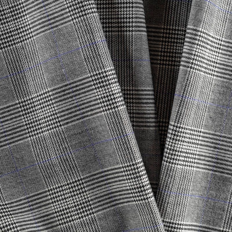 Ткань средней плотности, легкая и мягкая, приятная на ощупь, немного эластичная, хорошо драпируется и образует мягкие складки. Сочетание линий серого, молочного оттенков и принта "гусиная лапа" образует сложную красивую клетку. Монохромный строгий принт разбавляет еле уловимая элегантная тонкая толоска фиолетового цвета. Ткань отлично подойдет на костюмы, юбки, брюки, платья, жакеты.