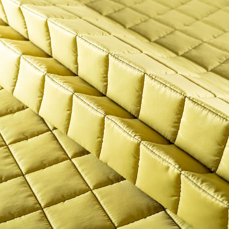 Трехслойная итальянская курточная ткань желто-зеленого оттенка, простеганная не крупными квадратами. Нижний слой черного цвета, заменяет подклад, средний слой - синтепон, верхний слой - матовый полиэстер, напоминающий болонь. Ткань легкая, пластичная, хорошо держит форму. Прекрасно подойдет для  пошива легких пальто, курток, бомберов, жилетов, накидок-кейпов, объемных сумок, одежды для домашних питомцев, туристического снаряжения.