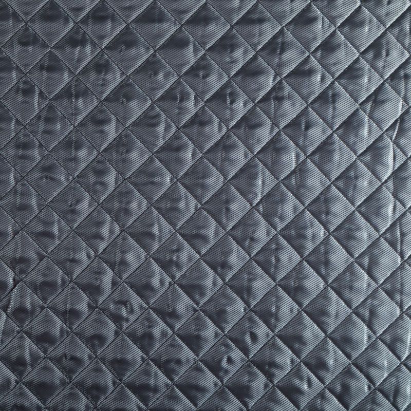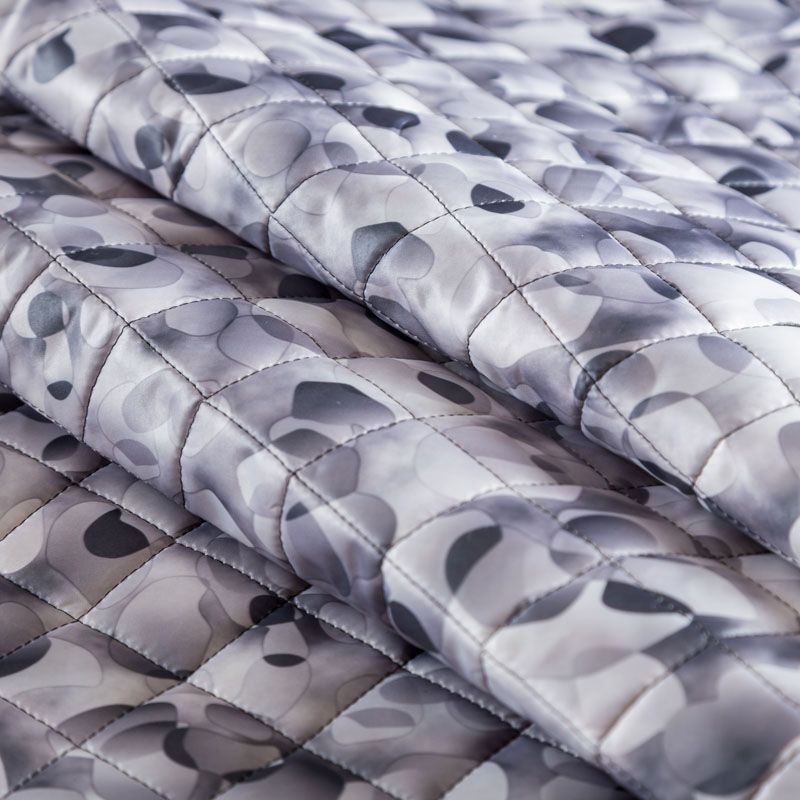 Трехслойная итальянская курточная ткань серого оттенка с абстрактным принтом, простеганная не крупными ромбами. Нижний, черного цвета, заменяет подклад и верхний слой - полиэстер, по качеству напоминает болонь, между ними синтепон. Ткань легкая, пластичная, хорошо драпируется. Прекрасно подойдет для  пошива легких пальто, курток, бомберов, жилетов, накидок-кейпов, объемных сумок, одежды для домашних питомцев, туристического снаряжения.