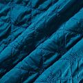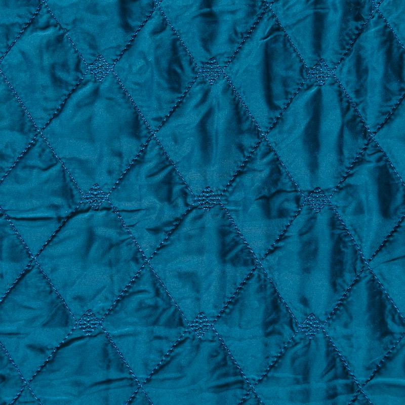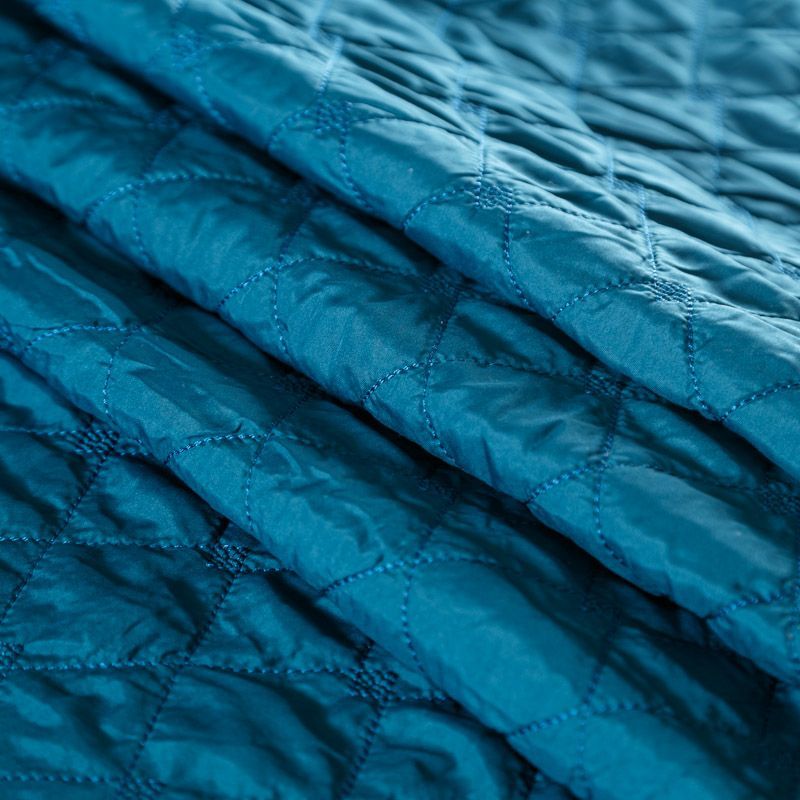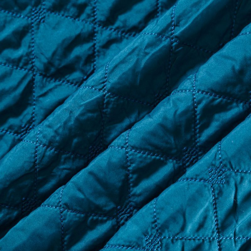 Двухслойная курточная ткань сине-зеленого оттенка, с геометрической стежкой нитками в тон полотну. Нижний слой - синтепон, верхний -  полиэстер, по качеству напоминает болонь. Ткань легкая, пластичная, хорошо драпируется. Прекрасно подойдет для  пошива пальто, курток, жилетов, накидок-кейпов, объемных сумок, одежды для домашних питомцев, туристического снаряжения.