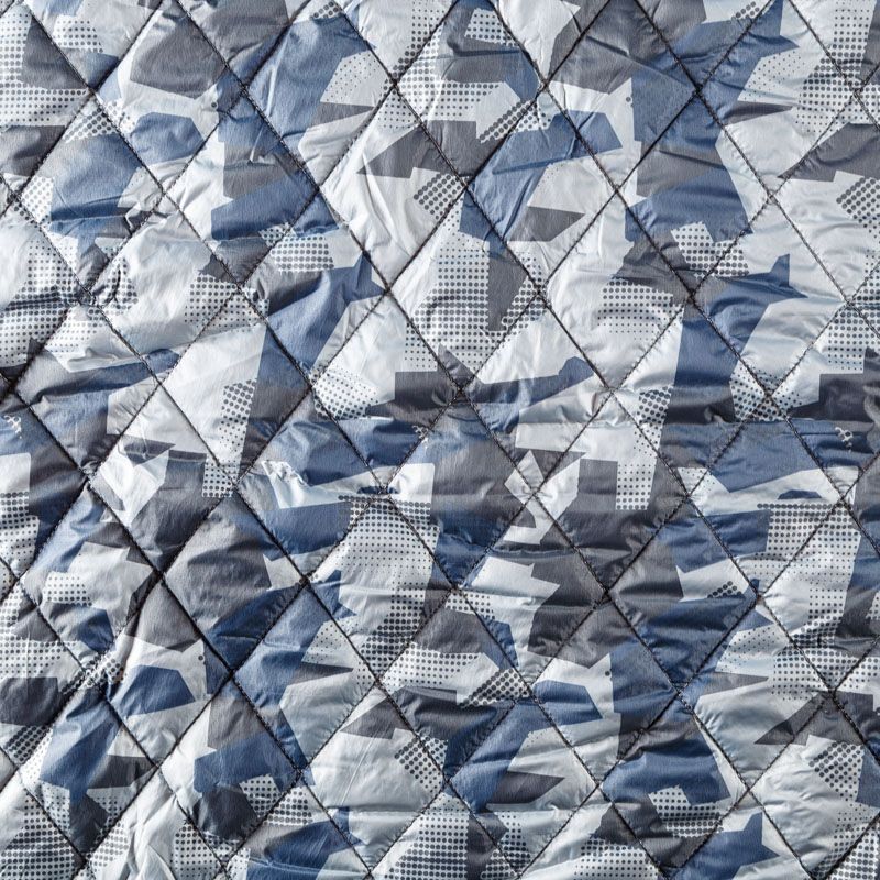 Двухслойная курточная ткань серебристого цвета с геометрическим принтом в сине-черной гамме, простеганная не крупными ромбами размером 4х4 см. Нижний слой - синтепон, верхний - полиэстер, по качеству напоминает болонь. Очень мягкая и легкая, пластичная, хорошо драпируется. Прекрасно подойдет для  пошива легких пальто, курток, жилетов, накидок-кейпов, объемных сумок.