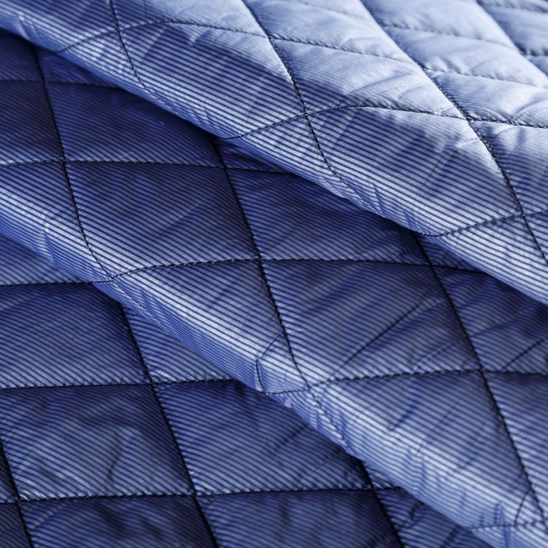 Двухслойная курточная ткань сине-голубого благородного оттенка с тонкими полосками темно-синего цвета, простеганная не крупными ромбами размером 5х5 см. Нижний слой - синтепон, верхний - полиэстер, по качеству напоминает болонь. Очень мягкая и легкая, пластичная, хорошо драпируется. Прекрасно подойдет для  пошива легких пальто, курток, жилетов, накидок-кейпов, объемных сумок.