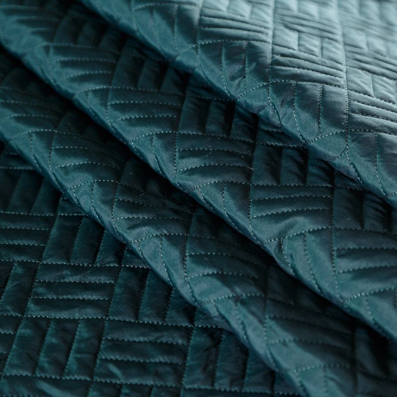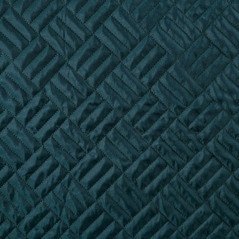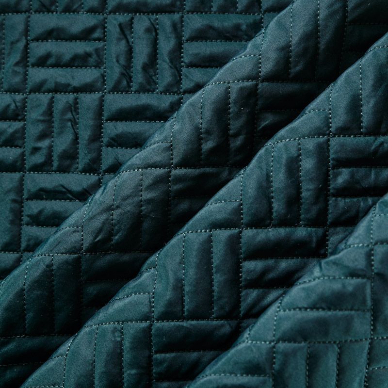 Двухслойная курточная ткань темно-зеленого оттенка, с геометрической стежкой нитками в тон полотну. Нижний слой - синтепон, верхний -  полиэстер, по качеству напоминает болонь. Ткань легкая, пластичная, хорошо драпируется. Прекрасно подойдет для  пошива пальто, курток, жилетов, накидок-кейпов, объемных сумок, одежды для домашних питомцев, туристического снаряжения.
