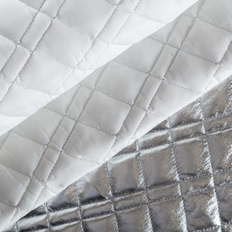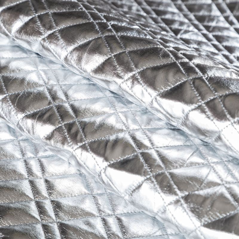Трехслойная курточная стежка серебристого цвета с блеском, простеганная не крупными ромбами и прямоугольниками. Верхний слой - полиэстер на трикотажной основе, имитирующий кожу, средний - синтепон, нижний слой - подкладочная ткань в тон лицевой.  Очень мягкая и легкая, пластичная, хорошо драпируется. Прекрасно подойдет для  пошива легких пальто, курток, жилетов, накидок-кейпов, объемных сумок.