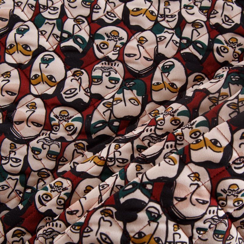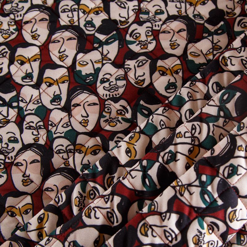 Итальянская трехслойная курточная ткань вишневого оттенка цвета с абстрактным принтом, простеганная ромбами. Нижний слой - гладкий матовый полиэстер красного цвета, средний слой - синтепон, верхний - принтованный креп-шифон. Очень мягкая и легкая, пластичная, хорошо драпируется. Прекрасно подойдет для пошива легких пальто, бомберов, парки, курток, жилетов, накидок-кейпов, объемных сумок.