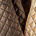 Курточный купон на синтепоне и подкладке, простеганный не крупными ромбами размером 3,5х3,5 см. С лицевой стороны тонкая, но прочная плащевая ткань с вышивкой в виде цветущей ветки сакуры, с изнаночной - желто-бежевая ткань с полоску. Материал мягкий, объемный и "воздушный", хорошо держит форму и подойдет для пошива легких пальто, курток, жилетов, накидок-кейпов, парки.