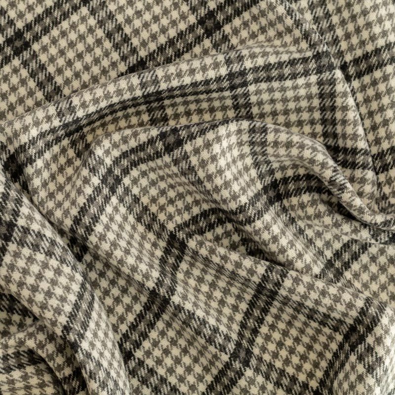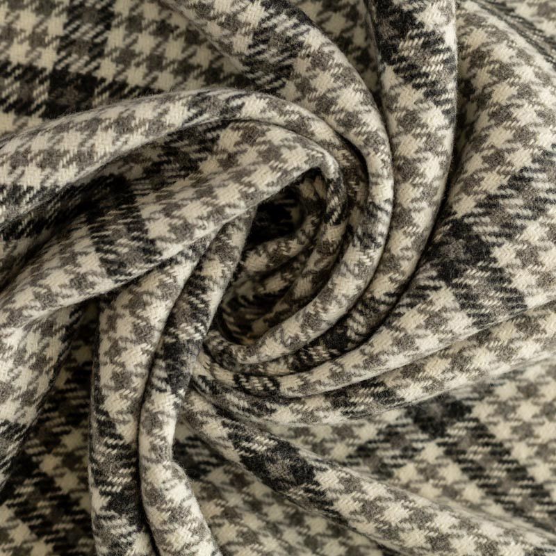 Стильная и элегантная пальтовая ткань с светлых тонах. Поверхность бархатистая, мягкая, очень приятная на ощупь, пластичная, мягко драпируется в складки, немного держит форму. Сочетание линий черного, серого оттенков и классического узора "гусиная лапка" образует сложную красивую клетку. Отлично подойдет для пошива пальто, теплых костюмов, юбки, шорт, жакета, кейпа, жилета.