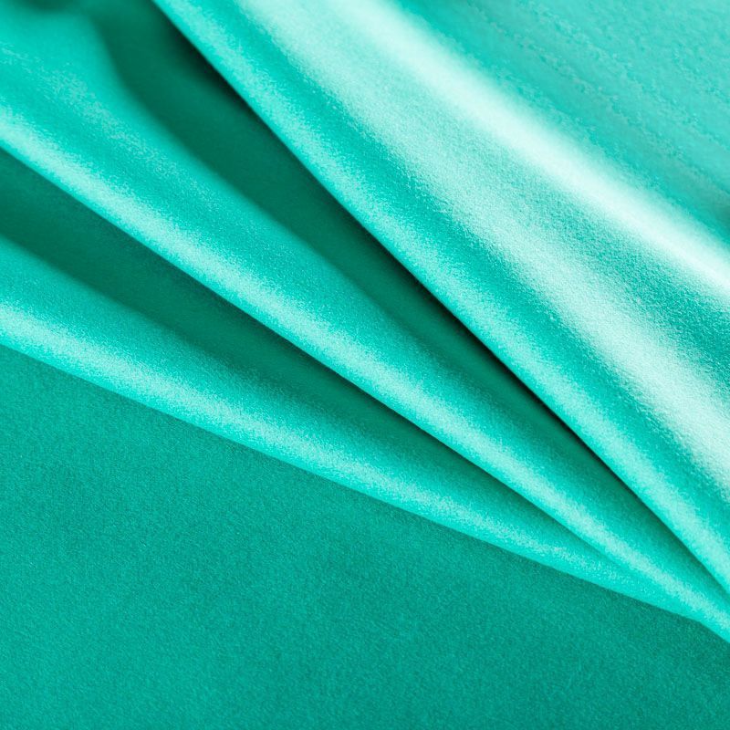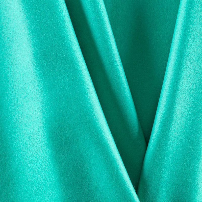 Пальтовая итальянская шерсть в оттенке тиффани. Ткань плотная, достаточно теплая, комфортная для одежды на сезон осень-зима. Полотно имеет короткий ворс. Мягкое и нежное на ощупь, не толстое и не тяжелое, хорошо держит форму. Прекрасно подойдет для пошива женских пальто, теплых костюмов, кейпов, мягких бомберов, жилетов и головных уборов.