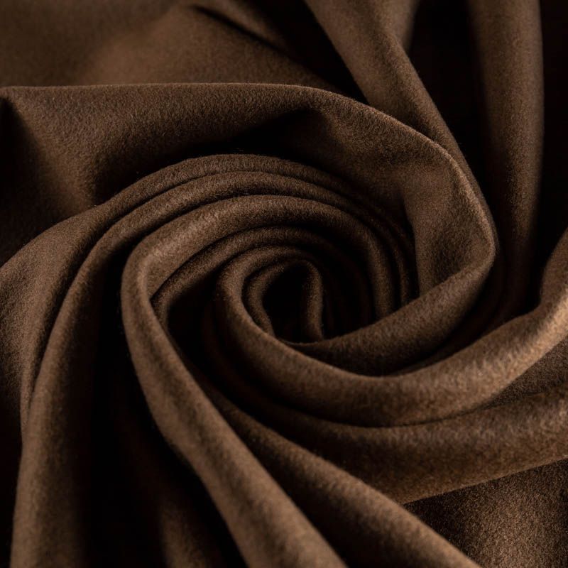 Пальтовая итальянская шерсть в коричневом оттенке. Ткань плотная, достаточно теплая, комфортная для одежды на сезон осень-зима. Полотно имеет короткий ворс. Мягкое и нежное на ощупь, не толстое и не тяжелое, хорошо держит форму. Прекрасно подойдет для пошива женских пальто, теплых костюмов, кейпов, мягких бомберов, жилетов и головных уборов.