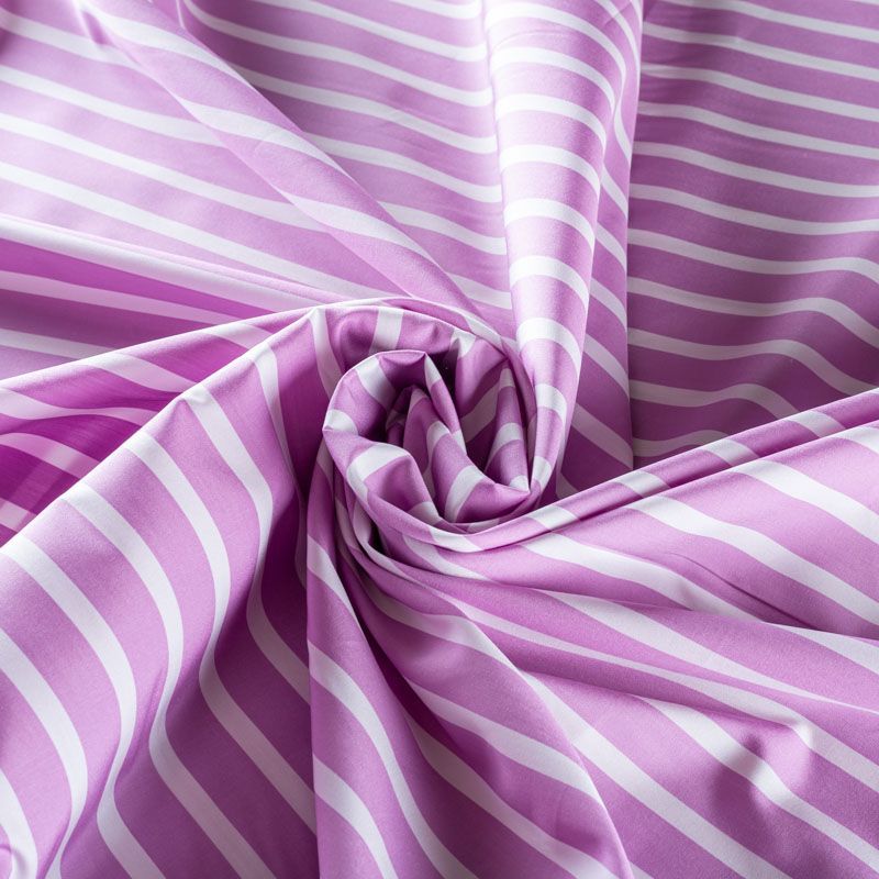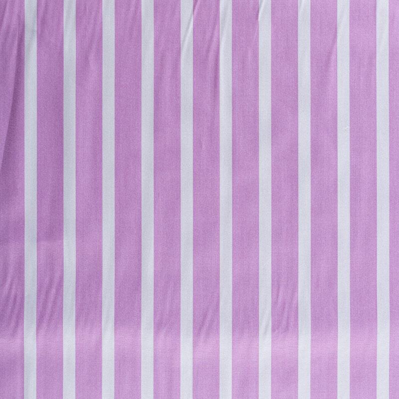Итальянский плательно-рубашечный хлопок сиреневого цвета в белую полоску средней ширины. Ткань мягкая, лёгкая, непрозрачная, пластичная и приятная к телу, хорошо драпируется, имеет гладкую матовую поверхность и сатиновое плетение. Прекрасно подойдет как для пошива платья-рубашки, сарафана, платьев различных фасонов, туники, топа, летнего костюма, комбинезона.
