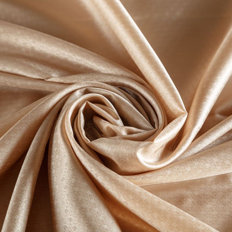 Итальянская подкладочная ткань из вискозы бежевого оттенка с жаккардовым геометрическим узором и красивым лоском. Полотно средней плотности, легкое, не просвечивает, хорошо скользит, не тянется. Подойдет для изготовления таких изделий, как пальто, костюмы, куртка, шуба, платье, жакет.