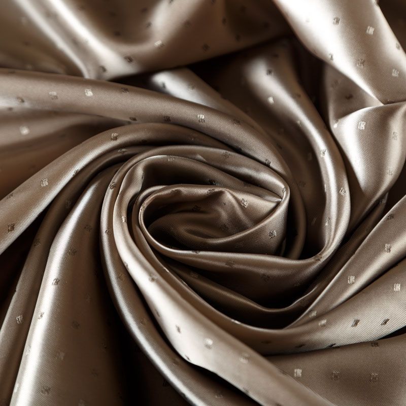 Итальянская подкладочная ткань из вискозы бронзового оттенка с редким жаккардовым узором и красивым блеском. Полотно средней плотности, легкое, не просвечивает, хорошо скользит, не тянется. Подойдет для изготовления таких изделий, как пальто, костюмы, куртка, шуба, платье, жакет.