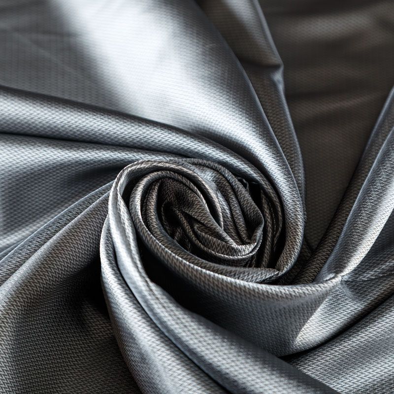 Смесовая подкладочная ткань серебристо-серого оттенка с жаккардовым геометрическим узором и красивым лоском. Полотно средней плотности, легкое, не просвечивает, хорошо скользит, не тянется. Подойдет для изготовления таких изделий, как пальто, костюмы, куртка, шуба, платье, жакет.