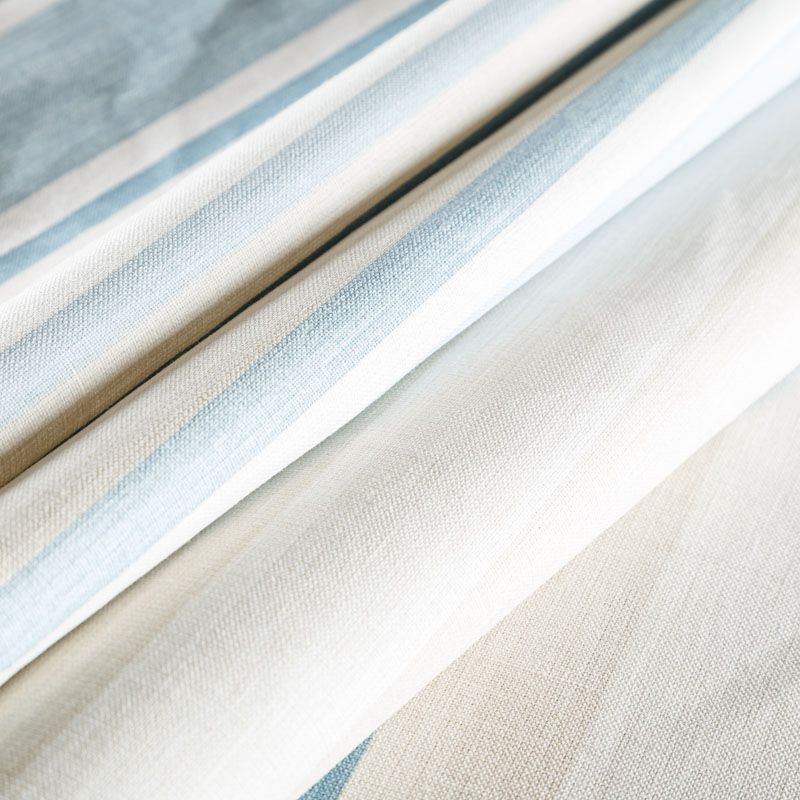 Матовая фактурная портьерная ткань в полоску, которая расположена вдоль кромки. Представлена в бежево-голубой палитре. Ткань средней плотности, без блеска, хорошо драпируется, имеет полонтяное переплетение. Прекрасно впишется в самые разные стилевые направления (прованс, кантри). Можно использовать для пошива портьер, римской шторы, салфеток, столового белья, подушек, покрывал и других предметов текстильного интерьера.