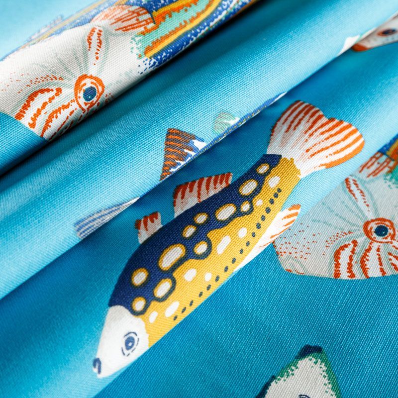 Матовая фактурная портьерная ткань лазурно-голубого оттенка с цветными яркими тропическими рыбками. Ткань средней плотности, без блеска, хорошо драпируется, имеет полонтяное переплетение. Прекрасно впишется в самые разные стилевые направления (прованс, кантри). Можно использовать для пошива портьер, римской шторы, салфеток, столового белья, подушек, покрывал и других предметов текстильного интерьера.