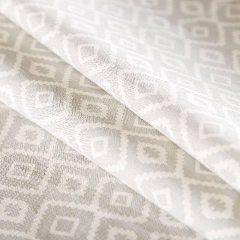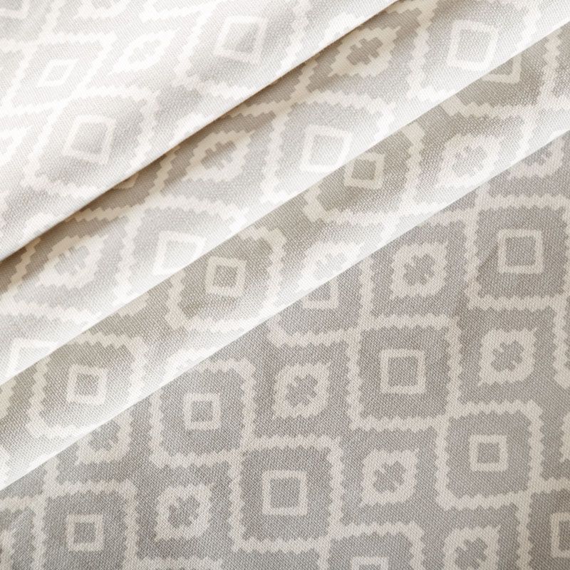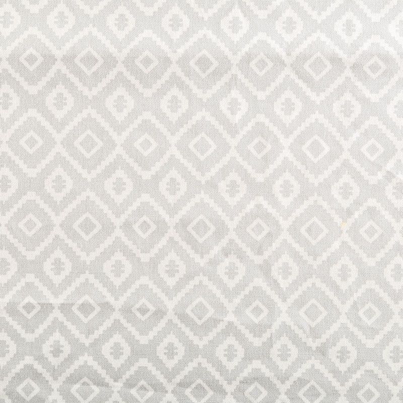 Хлопковая портьерная ткань от английского производителя. На  текстурированной серой основе наснесен геометрический узор в белом цвете. Ткань средней плотности, прекрасно держит форму, драпируется в устойчивые складки. Подойдет для классических портьер, римских штор, покрывал, подушек, скатертей, салфеток и других элементов текстильного интерьера как в самостоятельном исполнении, так и качестве компаньона к однотонным варинтам.