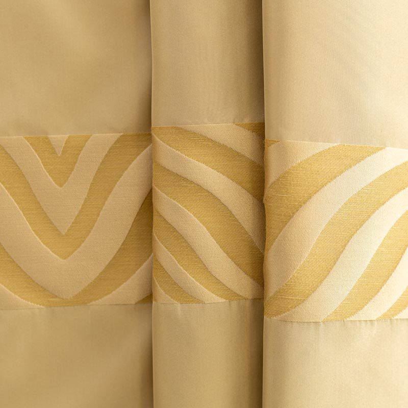По своей структуре шелковые портьерные ткани являются мягким и красивым материалом, способным отражать свет. Изделия из шелка удивительно переливаются и блестят, придавая интерьеру помещения особую атмосферу и вид. Такие портьерные ткани лучше всего применять для создания покрывал, наволочек, штор, легких, воздушных и светлых – они отлично подойдут для затемненных мест либо закрытых окон. Ткань имеет вертикальные полосы в разных оттенках золотисто-бежевого цвета, а так же сочетает в себе чередование полос матовой и блестящей текстур.