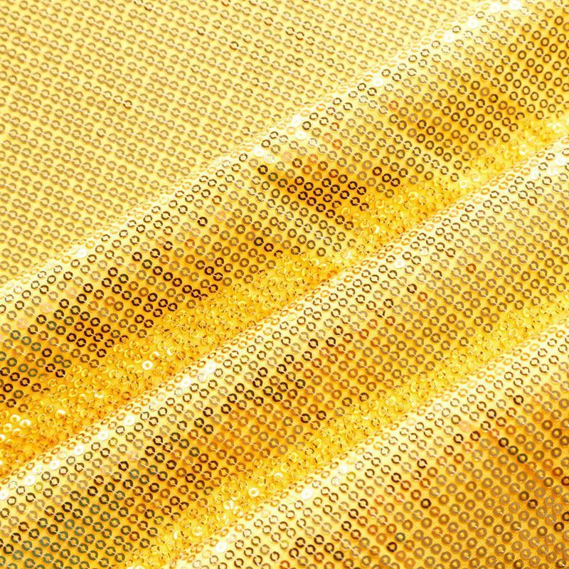 Блестящие пайетки в золотом цвете. Мелкие, размером около 2 мм. Основа - "холодное" тонкое трикотажное полотно, комфортное в носке. Ткань не прозрачная, тянется.  Подойдет для вечернего, коктельного платья или юбки, комбинезона, топа, танцевальных и сценических костюмов.