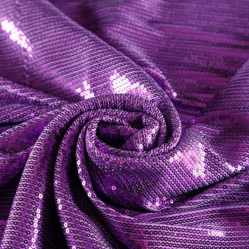 Блестящие пайетки насыщенного сиреневого оттенка. Мелкие, размером около 3 мм. Основа - трикотажное полотно, комфортное в носке. Ткань не прозрачная, тянется.  Подойдет для вечернего коктельного платья или юбки, комбинезона, топа, танцевальных и сценических костюмов.