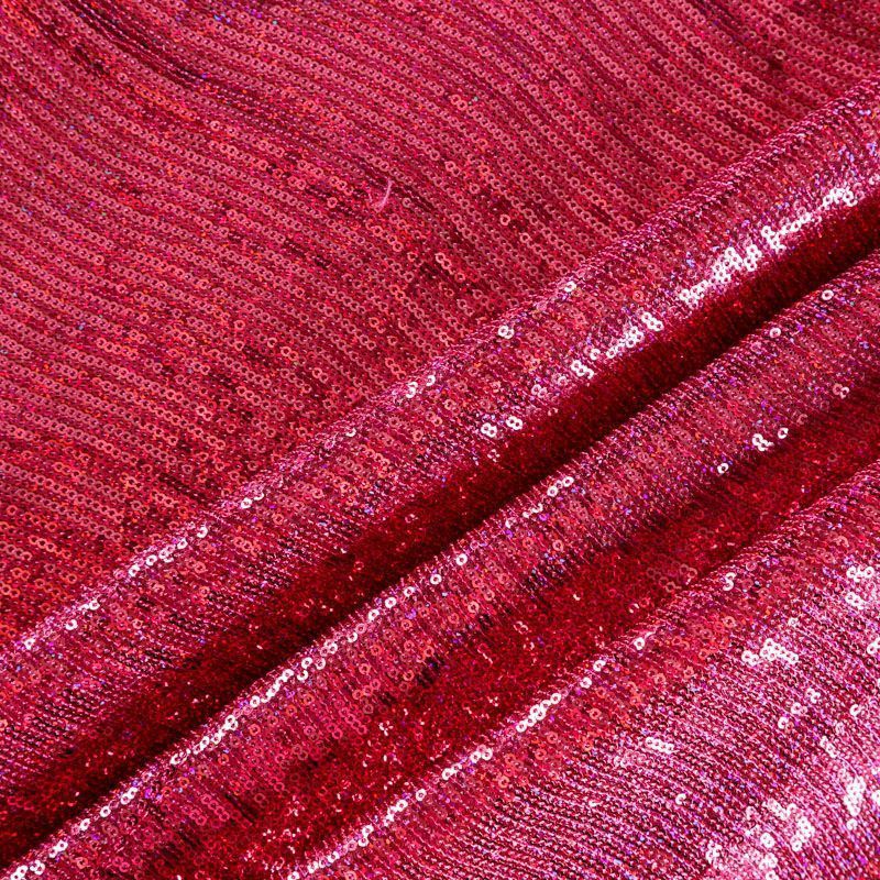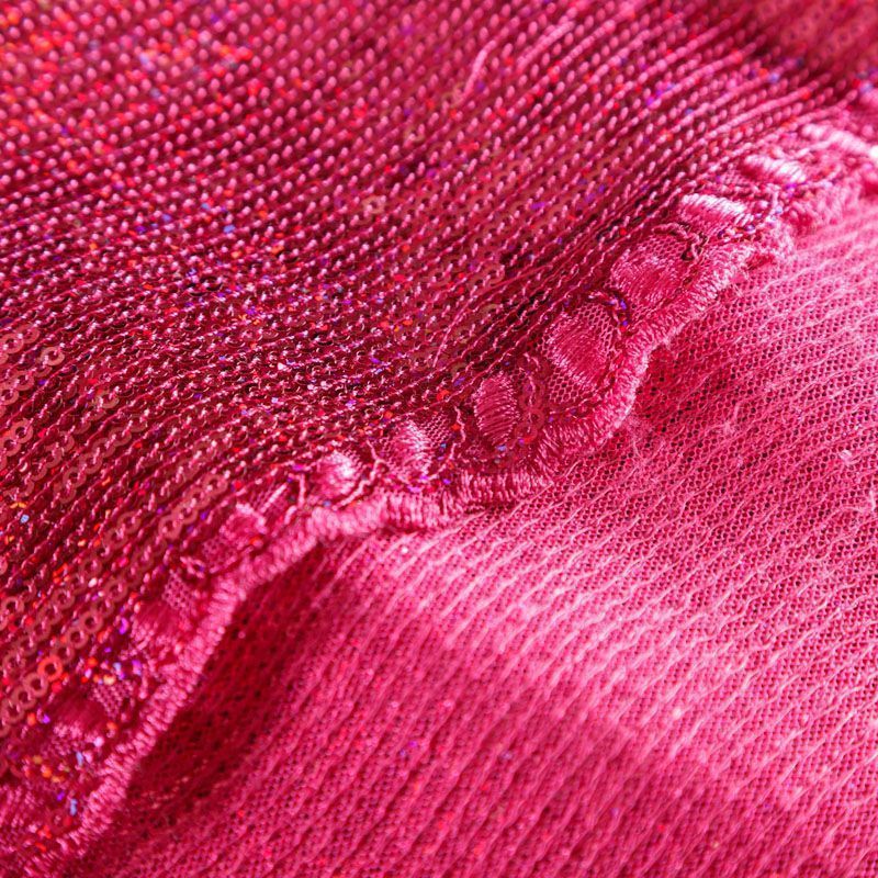 Эластичная сетка малинового оттенка по всей поверхности которой расположены глянцевые пайетки. Ткань очень хорошо драпируется, красиво переливается, имеет глянцевый блеск, пластичная, полоски расположены вдоль кромок, которые обработаны вышитым фигурным фестоном, набирается объемом,  Пайетки — идеальный материал для праздников и вечеринок. Из них получится эффектное платье, жакет, боди, туника, юбка или комбинезон.