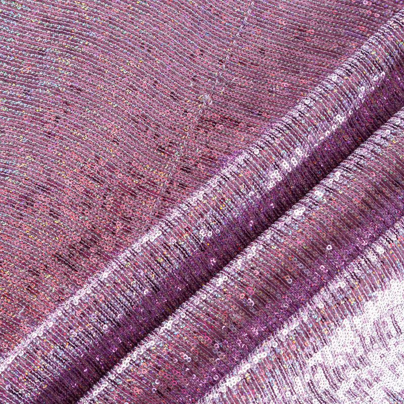 Эластичная сетка сиреневого оттенка по всей поверхности которой расположены глянцевые пайетки. Ткань очень хорошо драпируется, красиво переливается, имеет глянцевый блеск, пластичная, полоски расположены вдоль кромок, которые обработаны вышитым фигурным фестоном, набирается объемом, Пайетки — идеальный материал для праздников и вечеринок. Из них получится эффектное платье, жакет, боди, туника, юбка или комбинезон.