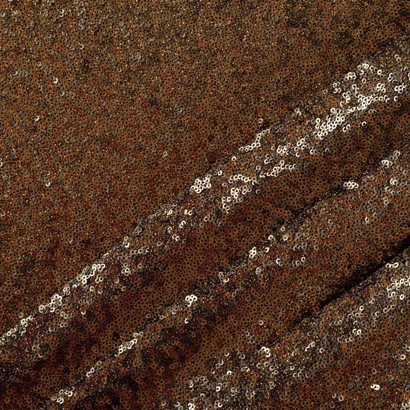 Мелкие пайетки бронзового оттенка на плотной сетчатой основе. Ткань хорошо драпируется, красиво переливается, имеет глянцевый блеск. Немного тянется, благодаря чему изделия получаются комфортными и отлично сидят по фигуре. Пайетки — идеальный материал для праздников и вечеринок. Из них получится эффектное платье, туника, юбка или комбинезон.