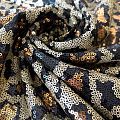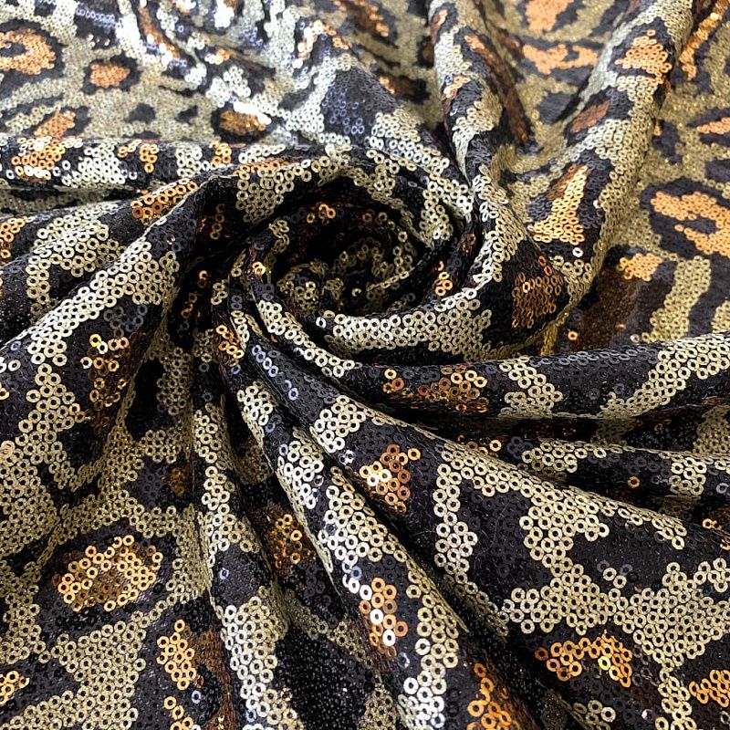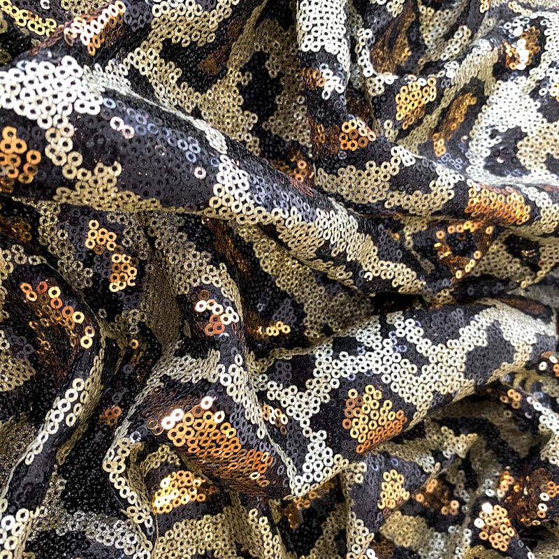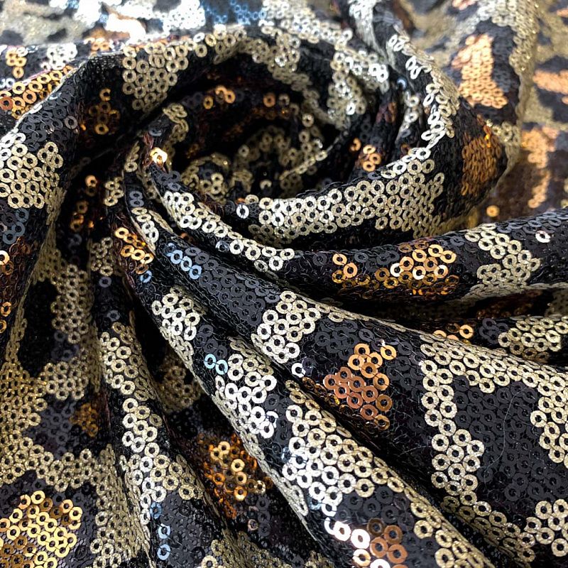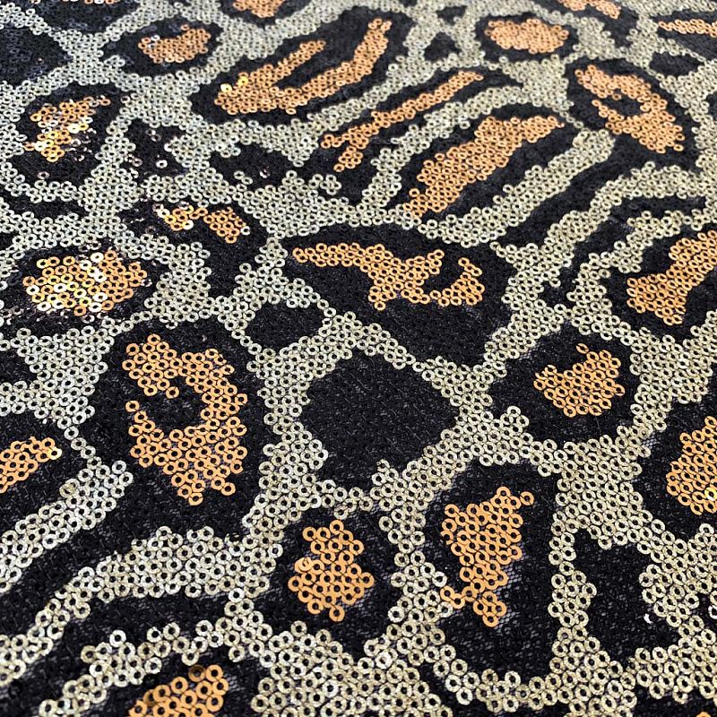 Пайетки в виде золотой шкуры леопарда с блестками. Вышиты на черной эластичной сетке. Роскошно смотрится в блестящих нарядных комбинезонах, сверкающих платьях и искрящихся блузках, юбках, туниках, концертных костюмах, нарядах для танцев.  На ощупь полотно не тяжелое, достаточно пластичное и удобное в носке.