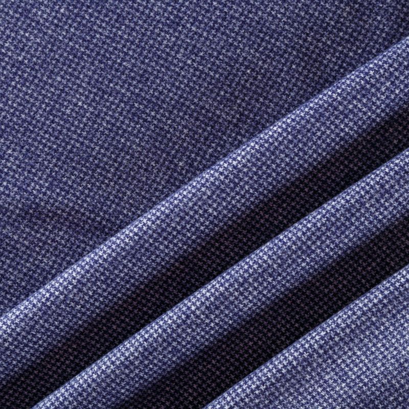 Трикотаж средней толщины, хорошо тянется за счет эластана в составе. Мелкий ненавязчивый узор "гусиная лапка" образуется переплетением фиолетово-синих и белых нитей. Ткань не сухая, мягкая, но плотная, не просвечивает, теплая, хорошо драпируется. Отлично подойдет для пошива легкой верхней одежды, жакетов, костюмов, юбок.
