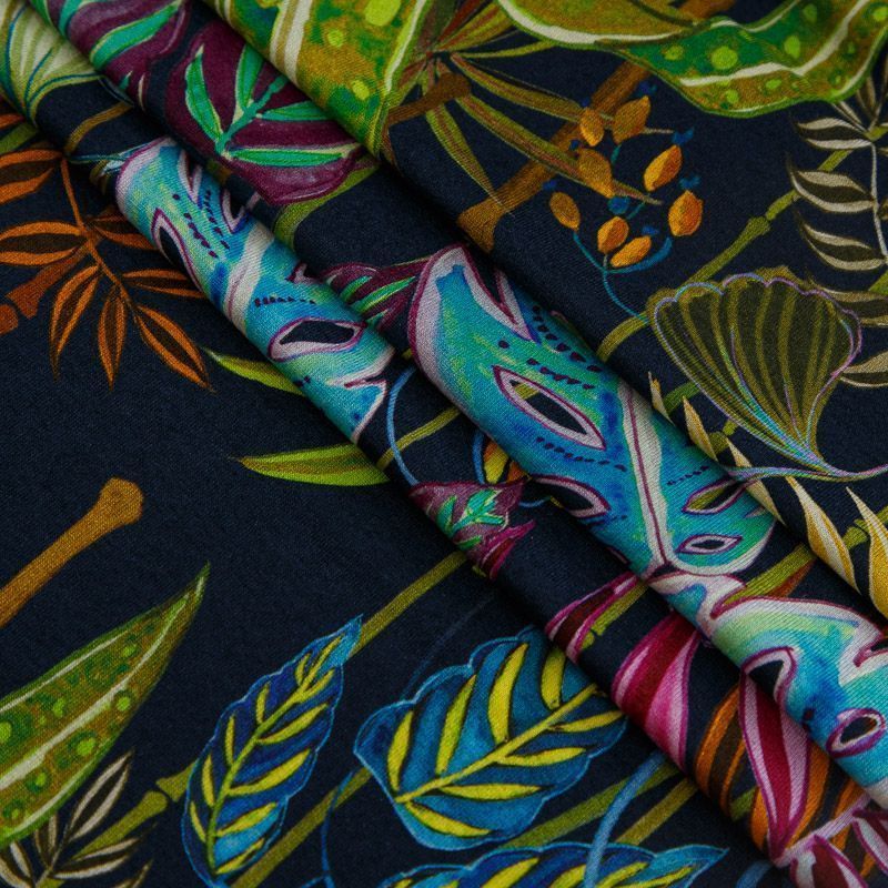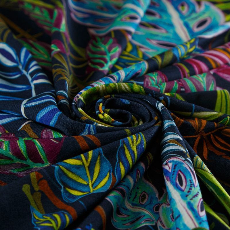 Итальянский мягкий хлопковый трикотаж черного цвета с ярким разноцветным тропическим принтом, гладкий, с красивым лоском. Материал очень приятный на ощупь, достаточно плотный, но при этом тонкий, просвечивает только при растяжении, сминается, но восстанавливется. Отлично тянется за счет плетения и содержания эластана. Отлично подойдет для пошива летних костюмов, топов, майки, футболки, платья, домашней одежды.