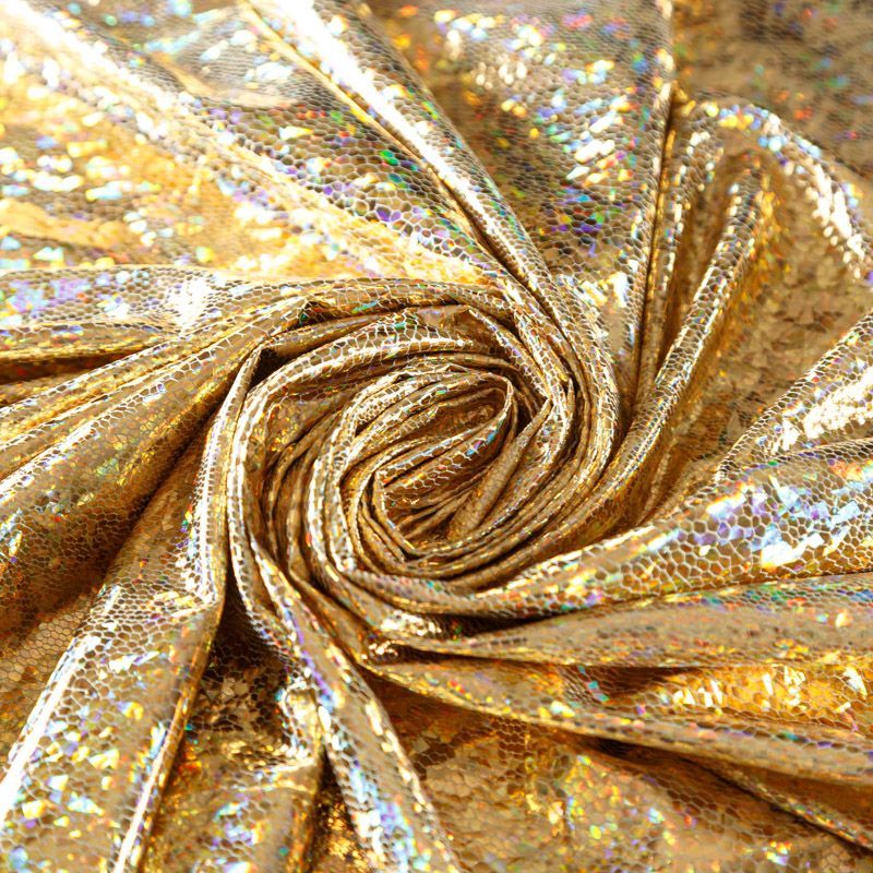 Эффектное трикотажное полотно с напыленными разноцветными блестками. Поверхность фактурная с рисунком под рептилию, который не деформируется при растяжении трикотажа. Материал очень пластичный, образует струящиеся мягкие складки, отлично тянется, не просвечивает, не мнется. Изнаночная сторона матовая, приятная на ощупь. Идеальный выбор для нарядных моделей, гимнастических и танцевальных костюмов.