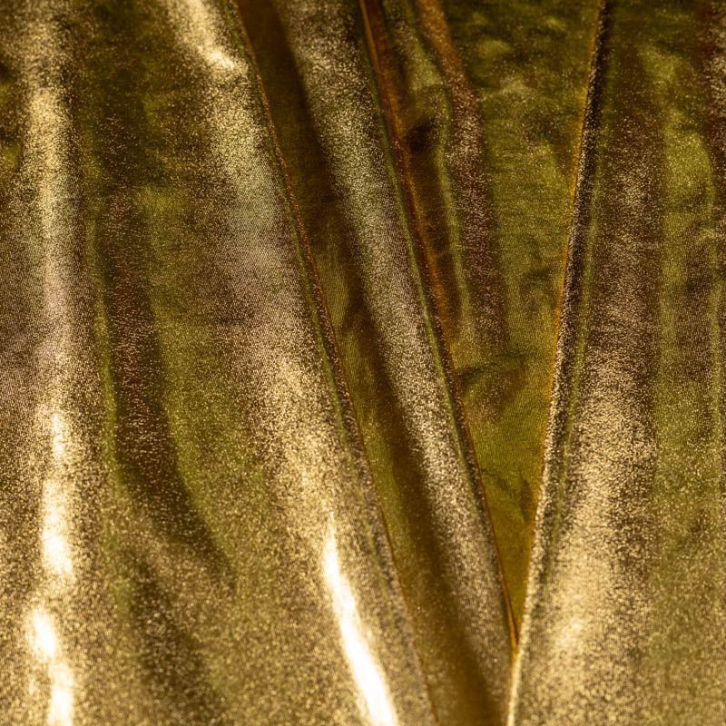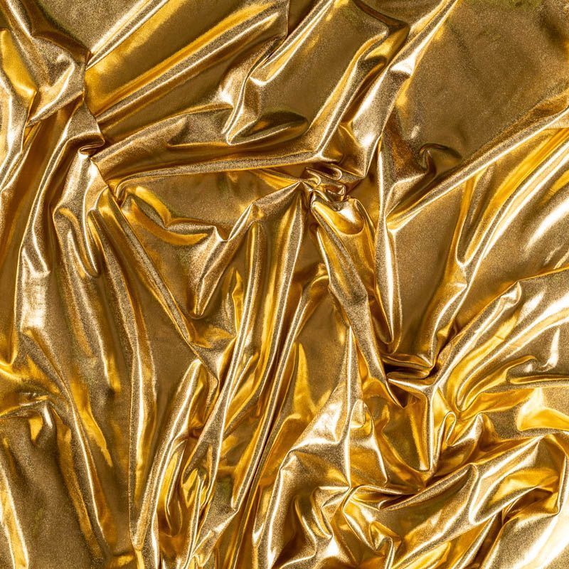 Эффектное трикотажное полотно с золотым металлическим блеском. Материал очень пластичный, образует струящиеся мягкие складки, отлично тянется, не просвечивает, не мнется. Изнаночная сторона матовая, приятная на ощупь. Идеальный выбор для нарядных моделей, гимнастических и танцевальных костюмов.