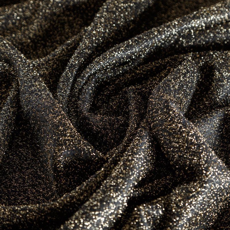 Нарядный трикотаж черного цвета с золотистым люрексом. Полотно мягкое, пластичное, хорошо драпируется, не колется и не просвечивает. Подойдет для пошива логслива, топа, туники, платья, кардигана, юбки.