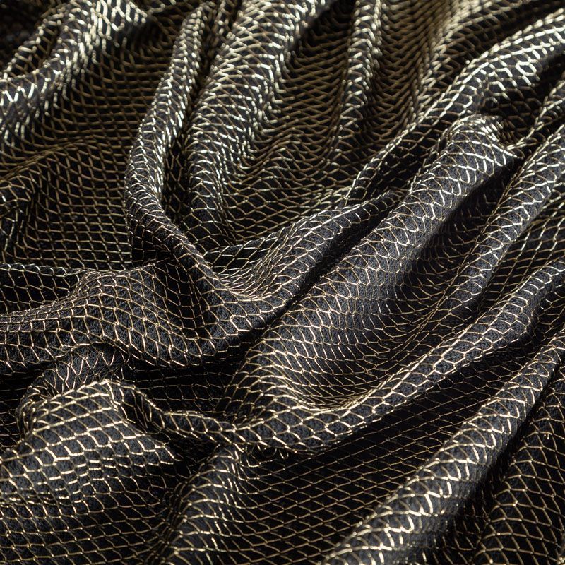 Тонкий ажурный вязаный трикотаж черного цвета декорирован золотистой люрексовой нитью, которая имитирует сетку. Ткань легкая, мягкая, не колется, прозрачная. Идеально подойдет для пошива водолазки, свитера, кардигана, а также для шарфа, снуда.