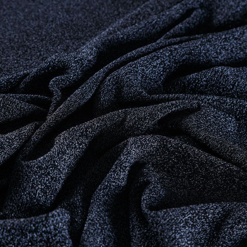 Трикотажное полотно с металлизированным блеском и  мерцанием. Люрексные нити синего оттенка вплетены в структуру полотна и создают объемный "вспененный" эффект, при этом изнанка гладкая и ровная. Ткань очень приятная к телу, не колется, не просвечивается, очень эластичная, отлично драпируется и ниспадает, красиво ляжет по фигуре. Идеальный вариант для пошива вечерних и нарядных платьев облегающего и свободного силуэта, топов, комбинезона, юбки, широких брюк, туник, кардиганов, накидок.