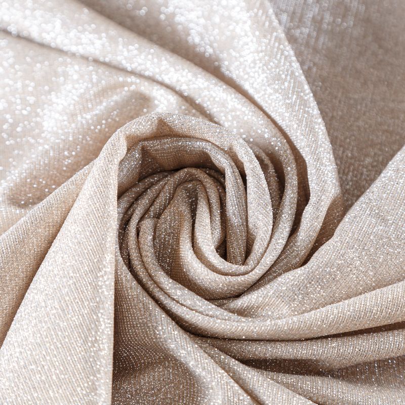 Тонкий и мягкий трикотаж золотистого оттенка с добавлением серебристой люрексной нити. Поверхность шероховатая на ощупь, трикотаж не рыхлый, пластичный, хорошо тянется, не просвечивает. Прекрасно подойдет для пошива лонгслива, гольфа, футболки, кардигана, платья или юбки в спортивном стиле.