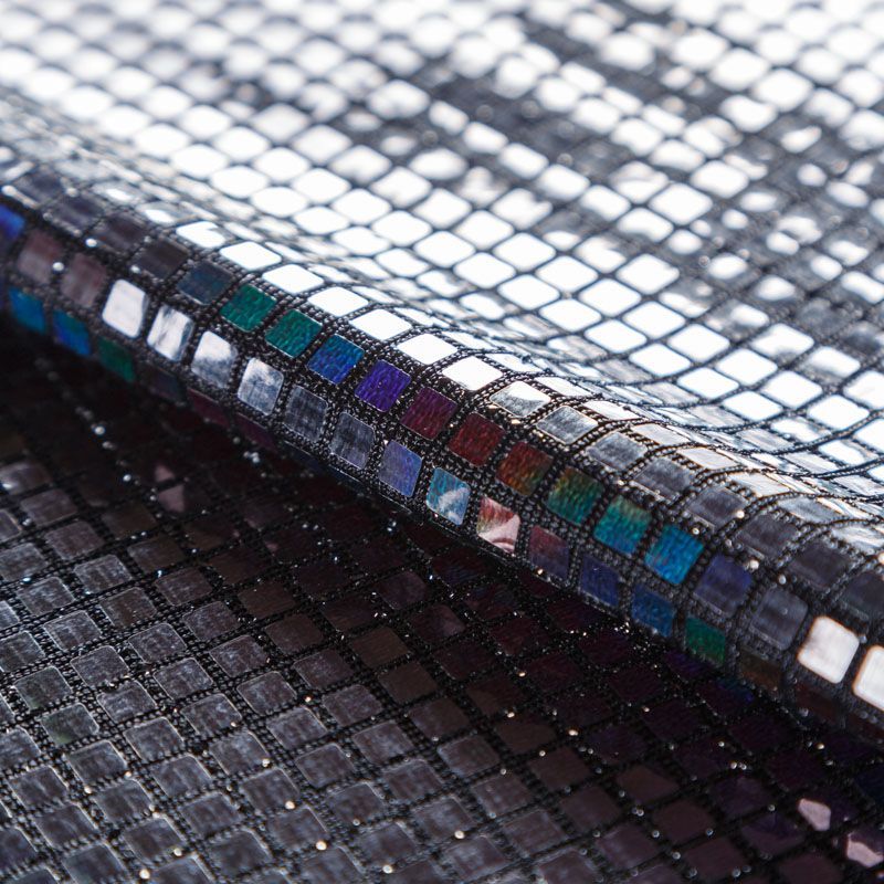Трикотажное черное полотно с блестящими зеркальными "бензиновыми" квадратными пайетками. Декор накатан на основу, поэтому будет комфортен в носке. Ткань пластичная, прекрасно драпируется и укладывается в складки, легко садится по фигуре за счёт основы с эластаном, не прозрачная, позволит шить изделия без подклада. Идеально подойдет для пошива нарядных вечерних образов: платья, юбки, топа, туники, широких брюк, жакета, кардигана.